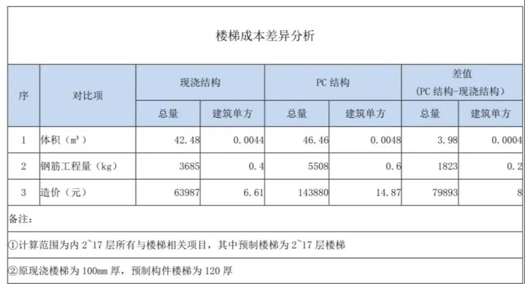 i樓板單價(jià):預(yù)制比現(xiàn)澆樓梯的價(jià)格高;ii混凝土含量:預(yù)制構(gòu)件比現(xiàn)澆構(gòu)件高;iii鋼筋含量:預(yù)制構(gòu)件比現(xiàn)澆構(gòu)件高;iv預(yù)制樓板免模板帶來的成本減少不能彌補(bǔ)以上三個(gè)因素引起的成本增加。且施工單位因?yàn)橹盁o預(yù)制構(gòu)件施工經(jīng)驗(yàn),在施工過程中疊合部處仍鋪設(shè)模板,沒有實(shí)現(xiàn)免模板施工,因此模板的費(fèi)用沒有節(jié)省,因無法實(shí)現(xiàn)免模板施工增加費(fèi)用約計(jì)30元/m2。①PC構(gòu)件設(shè)計(jì)優(yōu)化:②需要提前策劃,否則會(huì)無法實(shí)現(xiàn),導(dǎo)致雙倍成本,疊合板處可節(jié)省模板,疊合板處可不使用滿堂腳手架,這兩點(diǎn)必須提前策劃,安排勞務(wù)班組。而現(xiàn)實(shí)施工中往往這部分費(fèi)用無法節(jié)省引起費(fèi)用增加約30元/平。